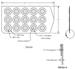 •         產品由上下兩部分構成:上層是No.1.5厚度的玻璃蓋玻片,下層是0.5mm厚度的透明硅膠片,無菌包裝可直接使用。設計上硅膠片較玻璃片略大,比如蓋玻片12*12mm大小,下方的硅膠片17*17mm大小,產品大小特別適于培養皿和培養板使用。包裝時,背襯底板是透明大塑料板,一板15個,一包有5板(共計75個)。